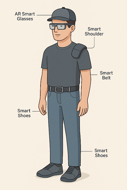 Cross-Device Synchronization: Smart glasses, hats, shoes, belts, and shoulders communicate in real time to enhance user experience.