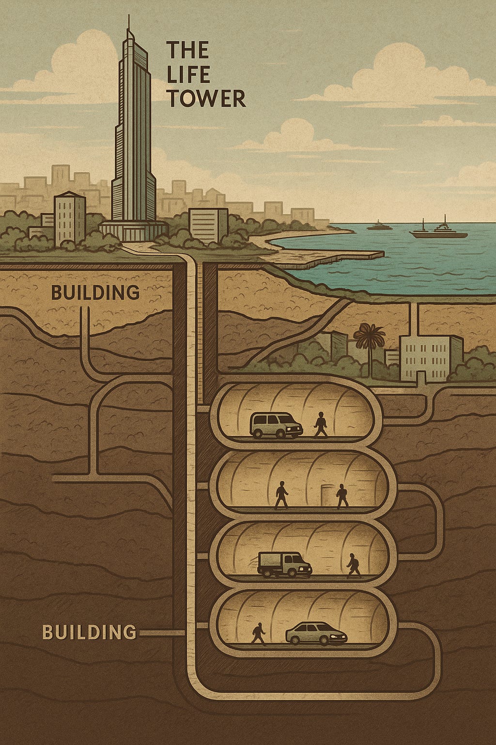 While The Life Tower rises over 1,000 meters into the sky, its true power lies deep beneath the earth. Beneath its monumental foundation extends a vast and sovereign tunnel system—an underground lifeline that connects The Life Tower to the heart of Kiryat Yam and beyond. Engineered for resilience, secrecy, and continuity, this tunnel network is a critical component of the tower’s strategic and functional design.