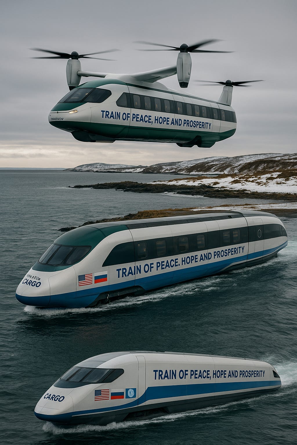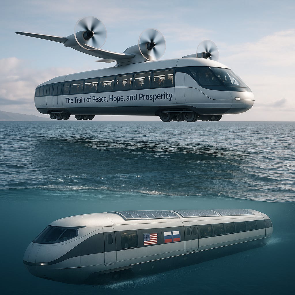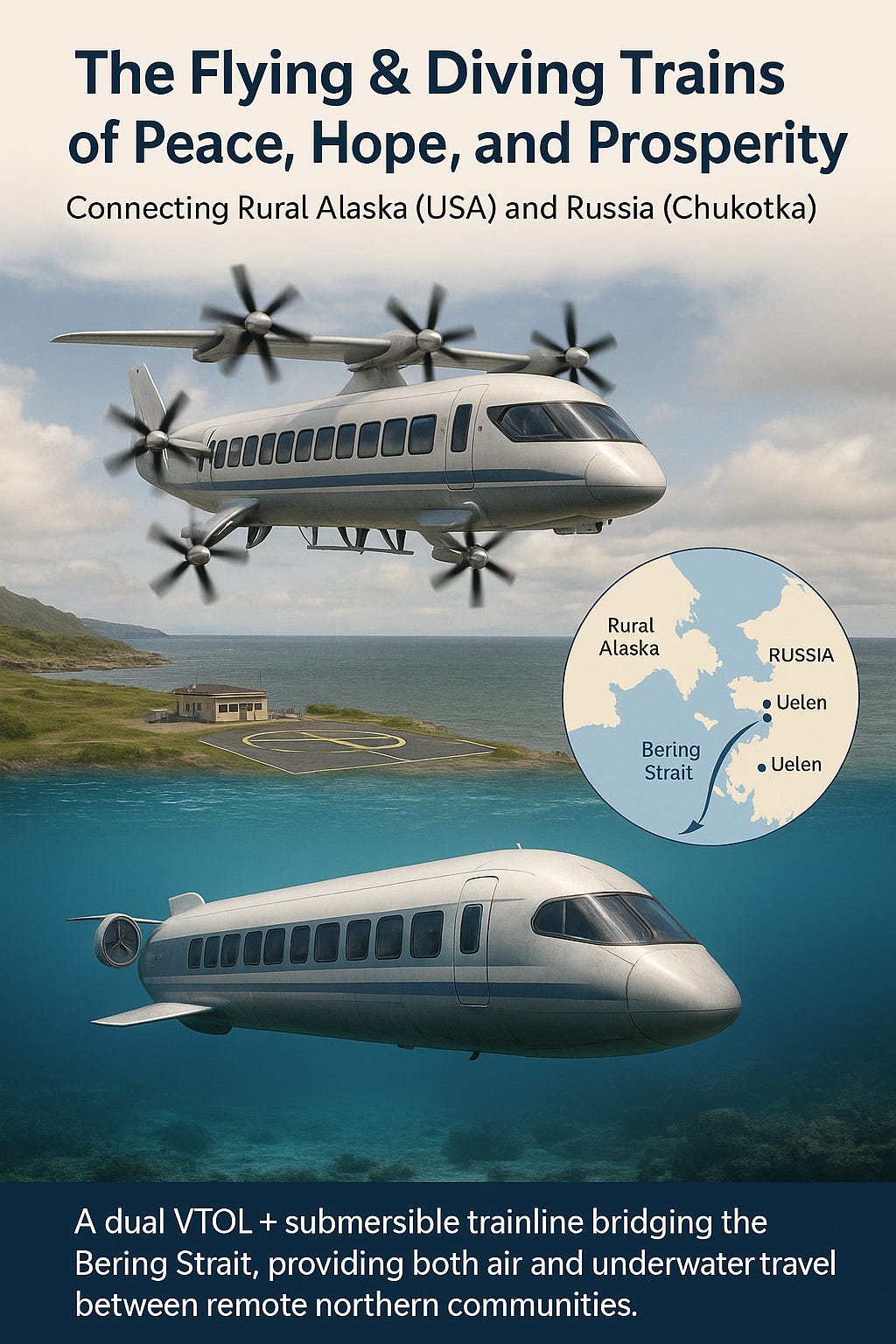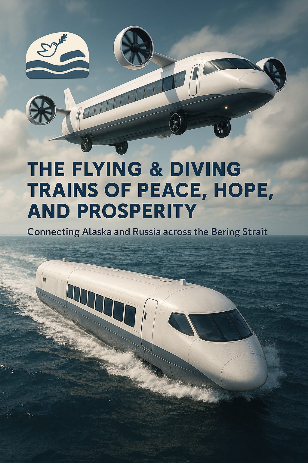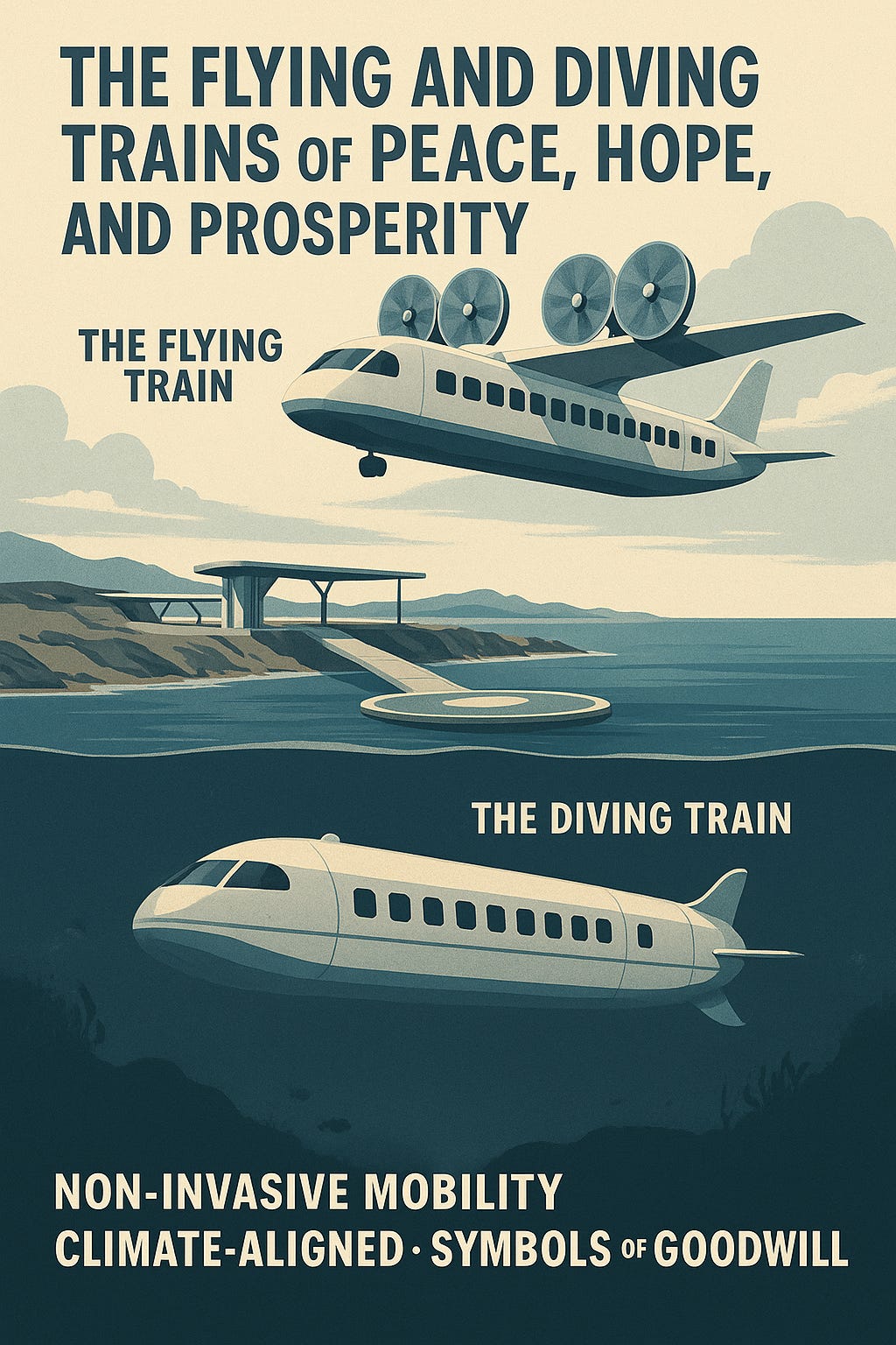 Introducing the Flying and Diving Trains of Peace, Hope, and Prosperity—modular, clean-energy vehicles that cross borders through the sky and under the sea, without laying a single rail or building a single bridge.