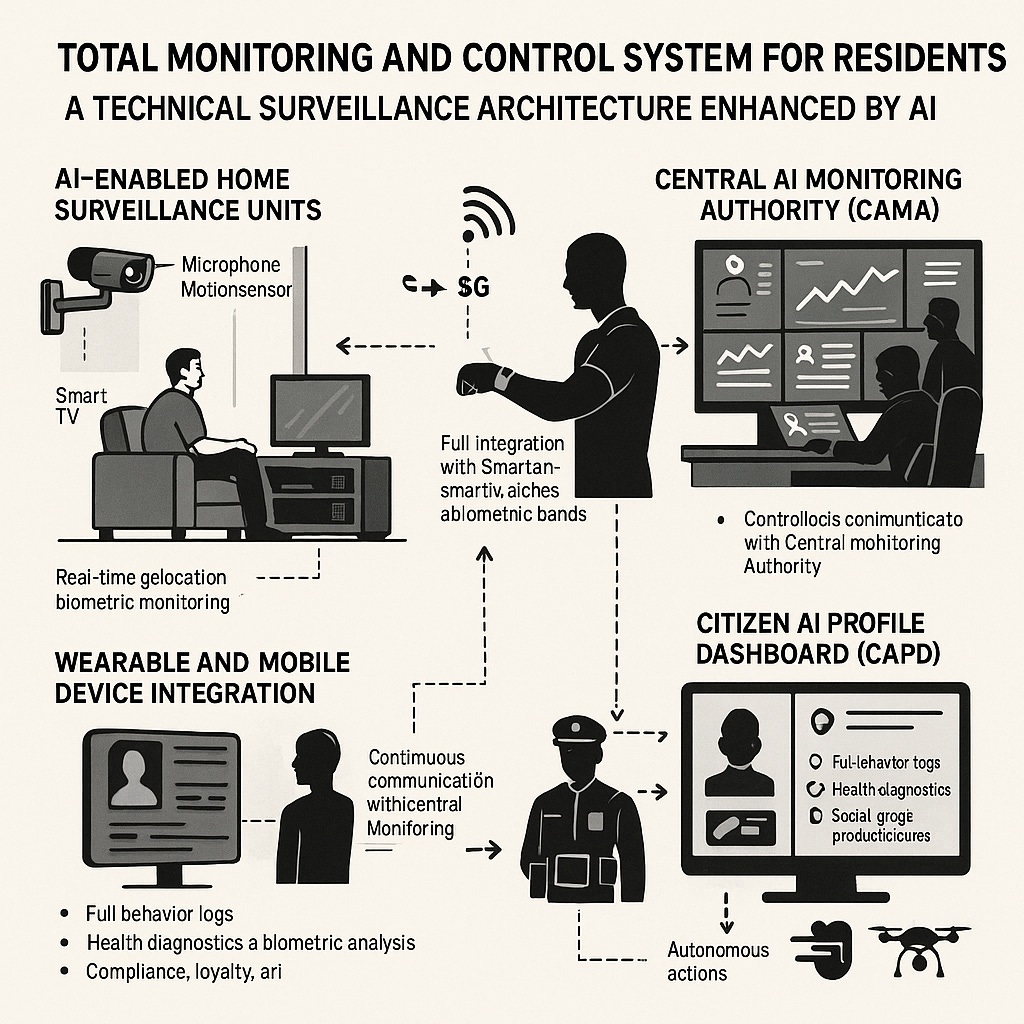 A Total Monitoring and Control System is a comprehensive digital framework that enables governments to observe and manage citizens in real time. It integrates smart home devices, wearable technology, mobile networks, and centralized AI analytics to build a live, detailed picture of individual and community behavior.