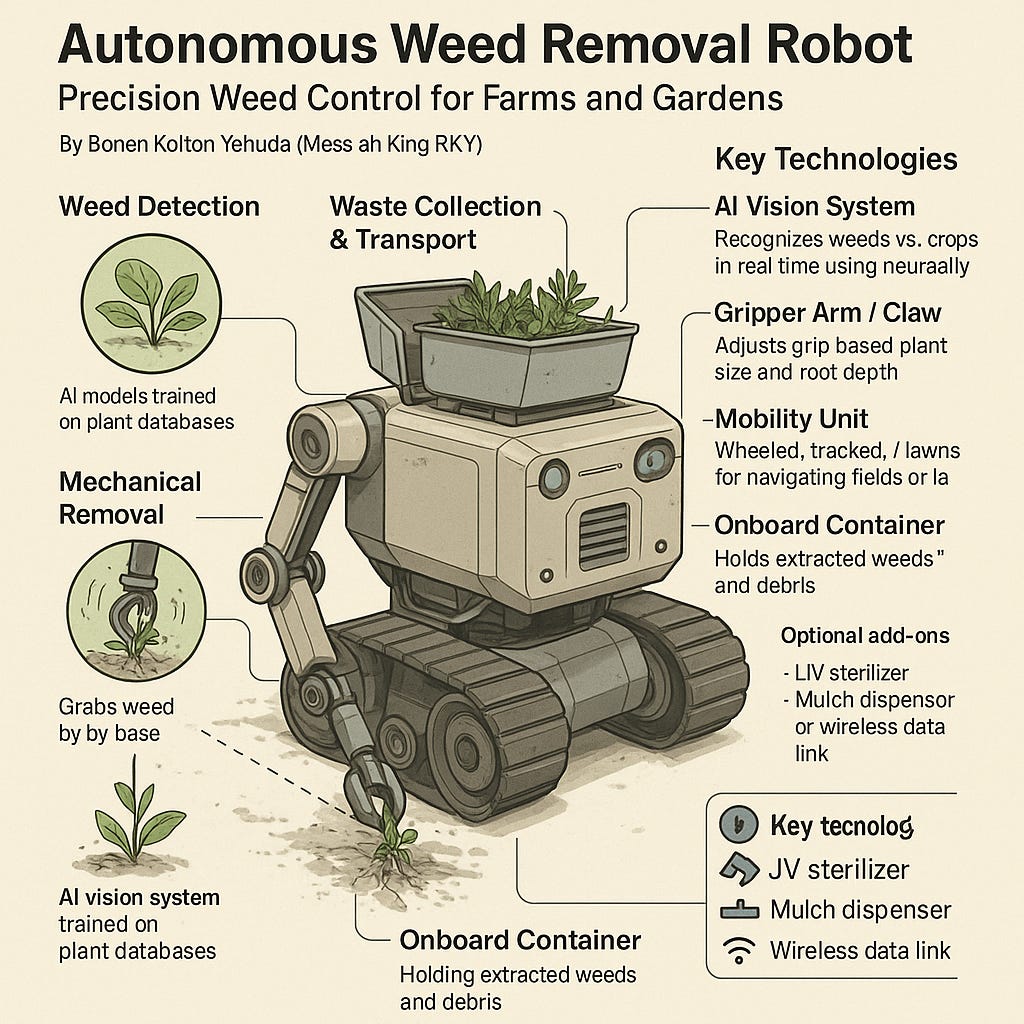 This article presents the design and operational framework for an Autonomous Weed Removal Robot—a mobile, intelligent platform for detecting, extracting, and storing weeds in agricultural fields and gardens. Unlike chemical or manual weeding methods, this robot leverages artificial intelligence (AI), computer vision, and electromechanical tools to provide sustainable, non-toxic, and cost-effective weed control. It integrates seamlessly with smart irrigation systems, soil sensors, and existing farm automation infrastructure.