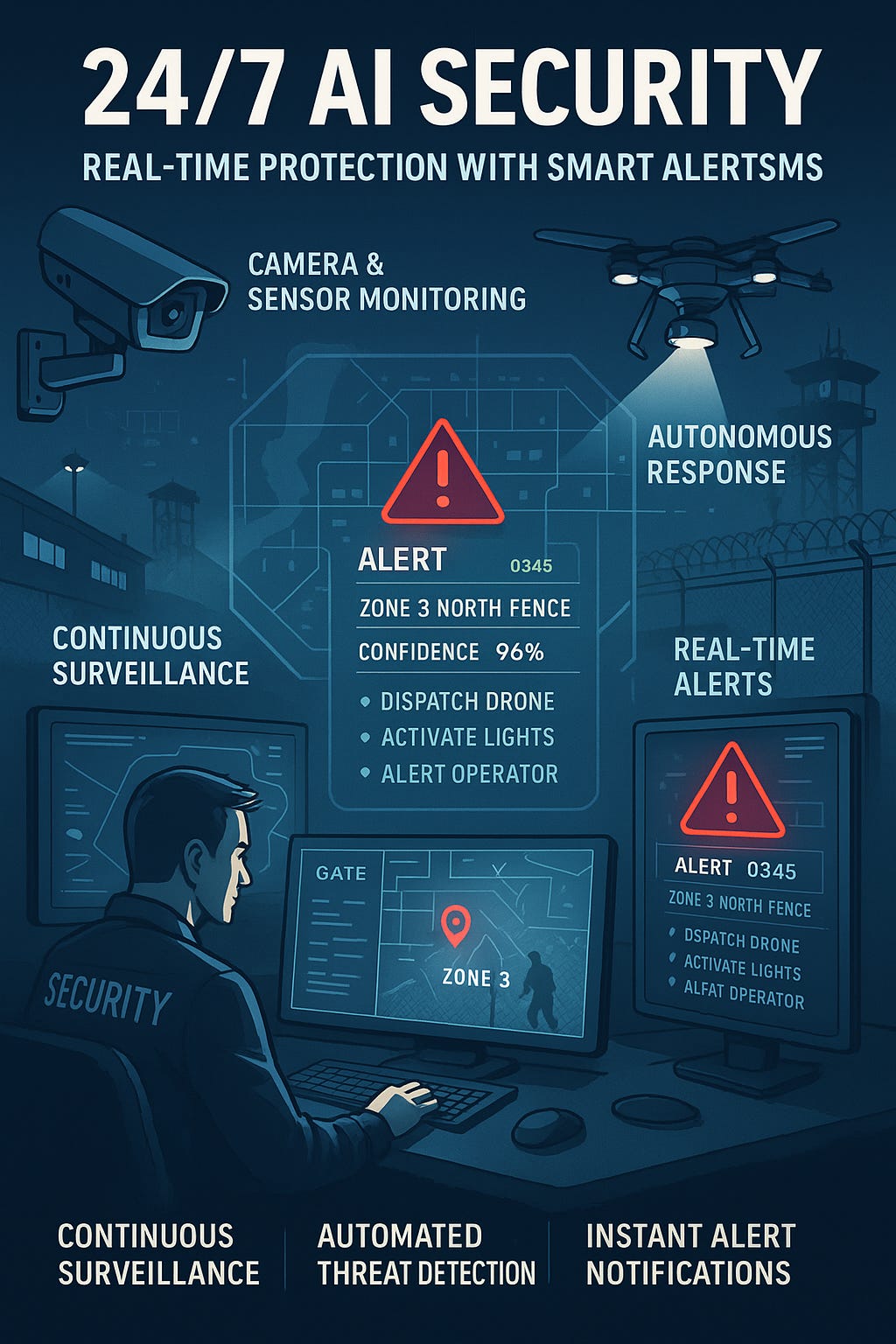 AI security, 24/7 monitoring, real-time threat detection, autonomous alerts, base protection, AI patrol, incident scripting, military AI, infrastructure defense, ethical AI security